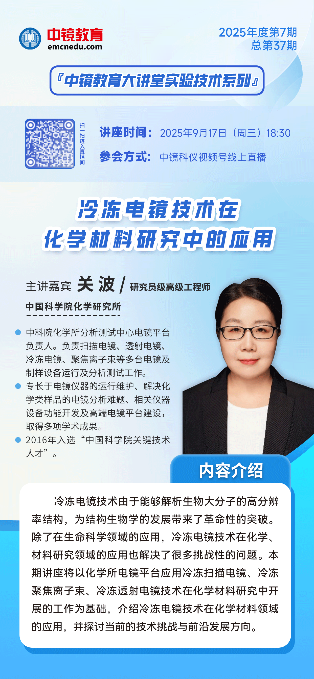 講座回放 中鏡教育大講堂-實(shí)驗(yàn)技術(shù)系列 2025年第7期(總第37期) 冷凍電鏡技術(shù)在 化學(xué)材料研究中的應(yīng)用 為推動(dòng)實(shí)驗(yàn)技術(shù)的蓬勃發(fā)展,打造行業(yè)學(xué)習(xí)交流的平臺(tái),由中鏡教育發(fā)起的2025年“中鏡教育大講堂”第七期-“實(shí)驗(yàn)技術(shù)系列”講座圓滿結(jié)束。 冷凍電鏡技術(shù)不僅為結(jié)構(gòu)生物學(xué)發(fā)展帶來革命性突破,近年來在化學(xué)、材料研究領(lǐng)域也發(fā)揮重要作用,成功解決了電子束敏感材料高分辨結(jié)構(gòu)表征、液相中組裝結(jié)構(gòu)微觀表征等諸多挑戰(zhàn)性問題。本期特邀中國科學(xué)院化學(xué)研究所分析測(cè)試中心電鏡平臺(tái)負(fù)責(zé)人、項(xiàng)目研究員級(jí)高級(jí)工程師關(guān)波老師,帶來《冷凍電鏡技術(shù)在化學(xué)材料研究中的應(yīng)用》專題講座。關(guān)波老師結(jié)合中國科學(xué)院化學(xué)研究所分析測(cè)試中心電鏡平臺(tái)實(shí)際工作,詳細(xì)介紹了冷凍掃描電鏡、冷凍聚焦離子束、冷凍透射電鏡技術(shù)在化學(xué)材料研究中的具體應(yīng)用,深入剖析技術(shù)要點(diǎn),并針對(duì)當(dāng)前冷凍電鏡技術(shù)面臨的挑戰(zhàn)與前沿發(fā)展方向展開探討。講座內(nèi)容緊密結(jié)合實(shí)踐、邏輯清晰,既有技術(shù)深度又有應(yīng)用廣度,精彩非凡! 現(xiàn)將本期講座回放發(fā)布,供大家學(xué)習(xí),歡迎大家觀看!