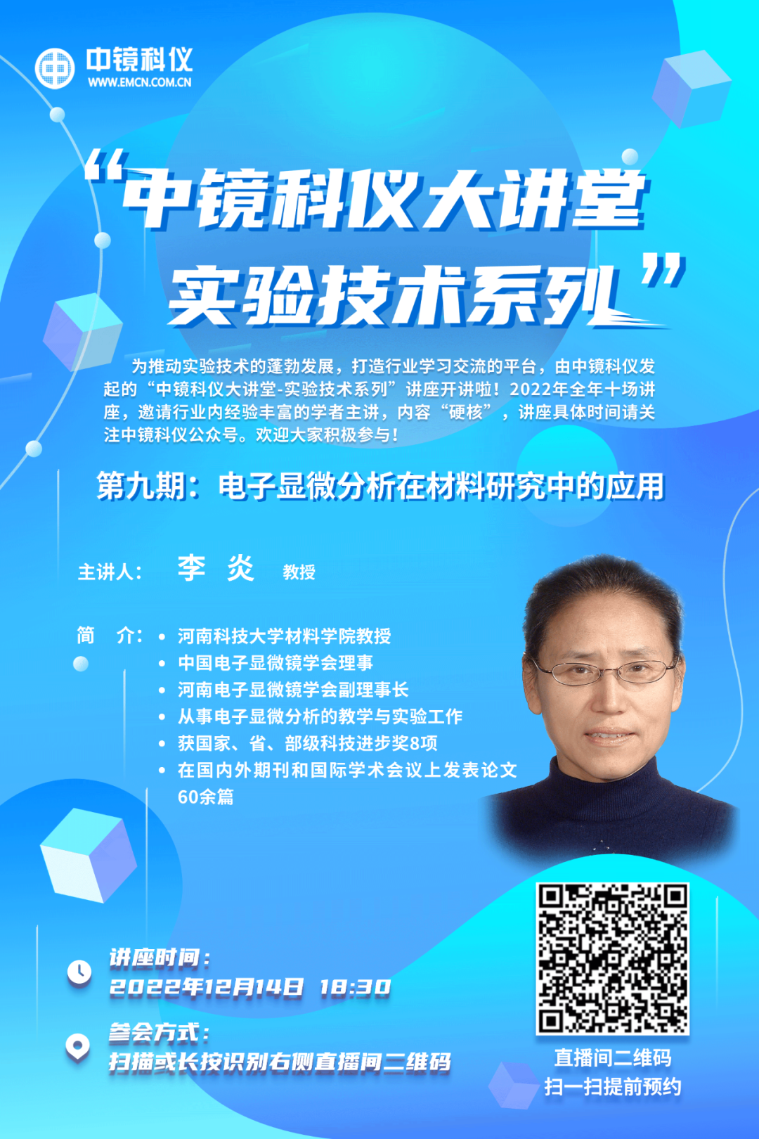 第九期:《電子顯微鏡分析在材料研究中的應(yīng)用》-李炎 現(xiàn)將本期講座回放發(fā)布,供大家學(xué)習(xí),歡迎大家觀看!本系列共十場講座,每月一期,具體時(shí)間請持續(xù)關(guān)注中鏡科儀公眾號,歡迎大家積極參與! 點(diǎn)擊觀看中鏡科儀大講堂-實(shí)驗(yàn)技術(shù)系列視頻回放