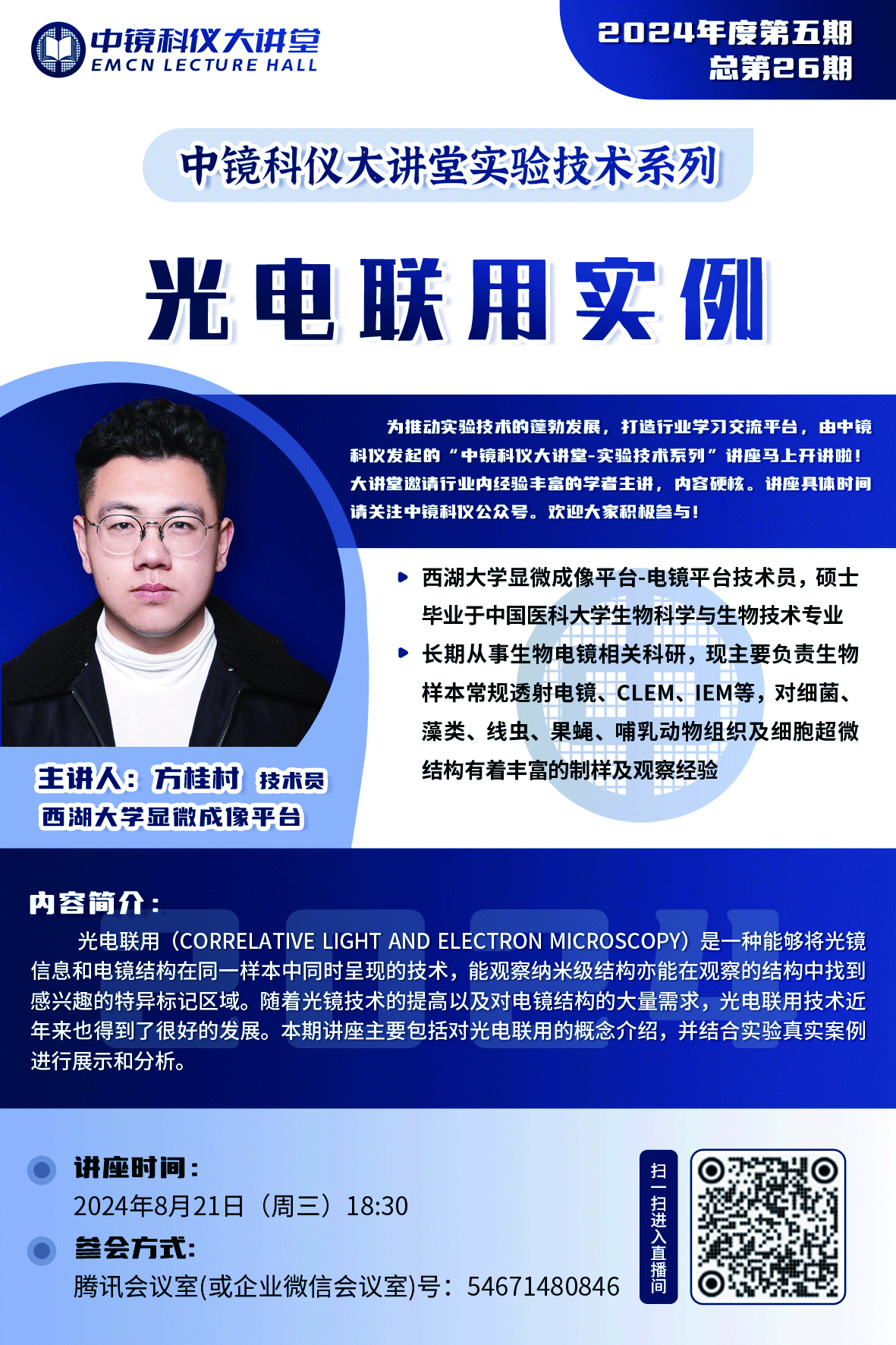 2024年“中鏡科儀大講堂”第五期-“實驗技術系列”講座將于2024年8月21日18:30開講。本期由西湖大學顯微成像平臺電鏡平臺技術員方桂村帶來的《光電聯用實例》專題講座將詳細介紹光電聯用的概念,并結合實驗真實案例進行深入剖析。歡迎大家積極參與,共同推動實驗技術的發展! 講座時間: 2024年8月21日(周三)18:30 參會方式: 騰訊會議室(或企業微信會議室)號:54671480846 掃碼進入微信視頻號 掃碼關注中鏡科儀