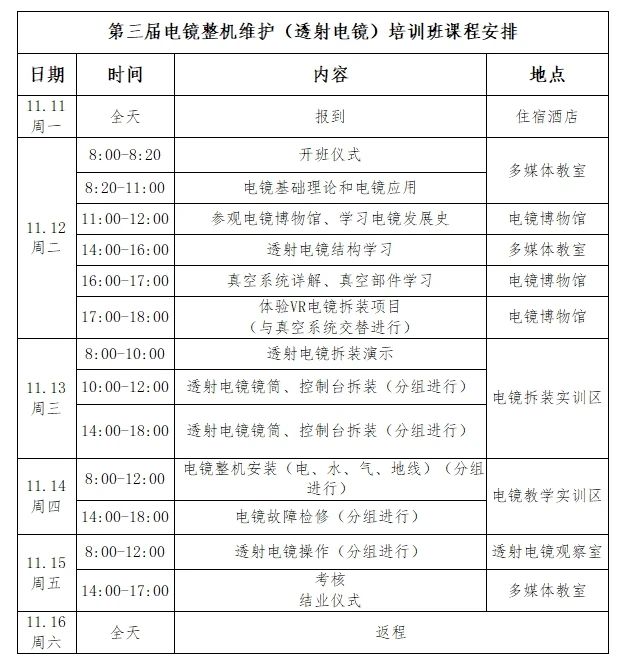 第三屆電鏡整機(jī)維護(hù) (透射電鏡)培訓(xùn)班 第二輪通知 由中國(guó)材料與試驗(yàn)標(biāo)準(zhǔn)化委員會(huì)科學(xué)試驗(yàn)裝置標(biāo)準(zhǔn)化技術(shù)委員會(huì)、開(kāi)封中鏡科儀職業(yè)技能培訓(xùn)學(xué)校主辦,河南化工技師學(xué)院承辦,河南元宇宙儀器有限公司協(xié)辦的第三屆電鏡整機(jī)維護(hù)培訓(xùn)班,定于2024年11月在河南省開(kāi)封市舉辦,屆時(shí)將邀請(qǐng)國(guó)內(nèi)知名專家對(duì)電鏡結(jié)構(gòu)及原理進(jìn)行講授,學(xué)員不僅可對(duì)透射電鏡進(jìn)行整機(jī)拆裝實(shí)踐練習(xí)、故障檢修、操作演示,還可以體驗(yàn)虛擬現(xiàn)實(shí)(VR)電鏡操作場(chǎng)景。歡迎廣大一線從業(yè)人員報(bào)名參加!本次培訓(xùn)班具體安排如下: 一、舉辦單位 主辦單位: 中國(guó)材料與試驗(yàn)標(biāo)準(zhǔn)化委員會(huì)科學(xué)試驗(yàn)裝置標(biāo)準(zhǔn)化技術(shù)委員會(huì) 開(kāi)封中鏡科儀職業(yè)技能培訓(xùn)學(xué)校有限公司 承辦單位: 河南化工技師學(xué)院 協(xié)辦單位: 河南元宇宙儀器有限公司 二、培訓(xùn)對(duì)象 本次培訓(xùn)主要面向電鏡一線工作者。 三、培訓(xùn)時(shí)間、地點(diǎn) 培訓(xùn)時(shí)間:2024年11月11日—16日(周一至周六) 培訓(xùn)地點(diǎn):河南省開(kāi)封市河南化工技師學(xué)院 推薦住宿:開(kāi)封中州華悅國(guó)際飯店 四、培訓(xùn)人數(shù) 為保證培訓(xùn)質(zhì)量和效果,本次培訓(xùn)通過(guò)采用小班培訓(xùn)方式,人數(shù)限定為20人(以報(bào)名先后順序?yàn)闇?zhǔn))。 五、培訓(xùn)費(fèi)用 培訓(xùn)費(fèi)用:3500元/人,交通及食宿費(fèi)用自理 住宿標(biāo)準(zhǔn):雙人標(biāo)間440元/間/天(合住220元/人/天) 六、培訓(xùn)證書(shū) 本次培訓(xùn)最終進(jìn)行結(jié)業(yè)考核,通過(guò)考核后頒發(fā)中國(guó)材料與試驗(yàn)標(biāo)準(zhǔn)平臺(tái)、全國(guó)分析檢測(cè)人員能力培訓(xùn)委員會(huì)(CSTM/NTC)聯(lián)合認(rèn)證證書(shū)。 七、報(bào)名方式 微信掃描“報(bào)名二維碼”報(bào)名。 八、交通推薦 1、開(kāi)封北站(高鐵): 開(kāi)封北站-開(kāi)封中州華悅國(guó)際飯店。 出租車車程預(yù)計(jì)12分鐘,費(fèi)用預(yù)估10元。 2、開(kāi)封宋城路站(城鐵): 宋城路站-開(kāi)封中州華悅國(guó)際飯店。出租車車程預(yù)計(jì)14分鐘,費(fèi)用預(yù)估11元。 九、聯(lián)系方式 趙勝藍(lán) 電話:13298325853 郵箱:edu@emcn.com.cn 中國(guó)材料與試驗(yàn)標(biāo)準(zhǔn)化委員會(huì)科學(xué)試驗(yàn) 開(kāi)封中鏡科儀職業(yè)技能培訓(xùn)學(xué)校 2024年10月10日 第三屆電鏡整機(jī)維護(hù)(透射電鏡)培訓(xùn)班課程安排